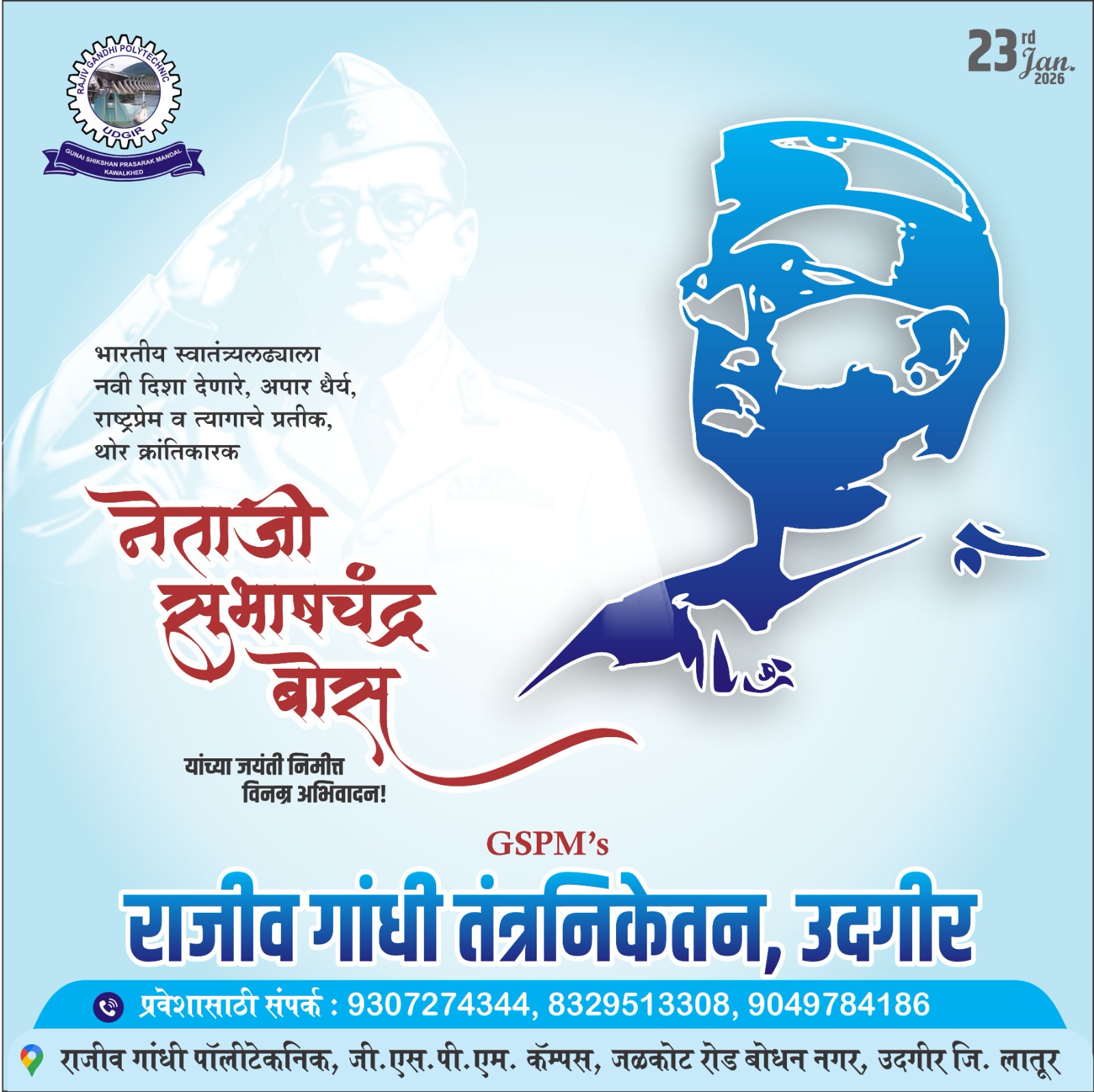 महान स्वातंत्र्यसैनिक व दूरदर्शी नेते नेताजी सुभाषचंद्र बोस यांच्या जयंतीनिमित्त राजीव गांधी तंत्रनिकेतन, उदगीर कडून त्या थोर देशभक्ताला मानाचा मुजरा.